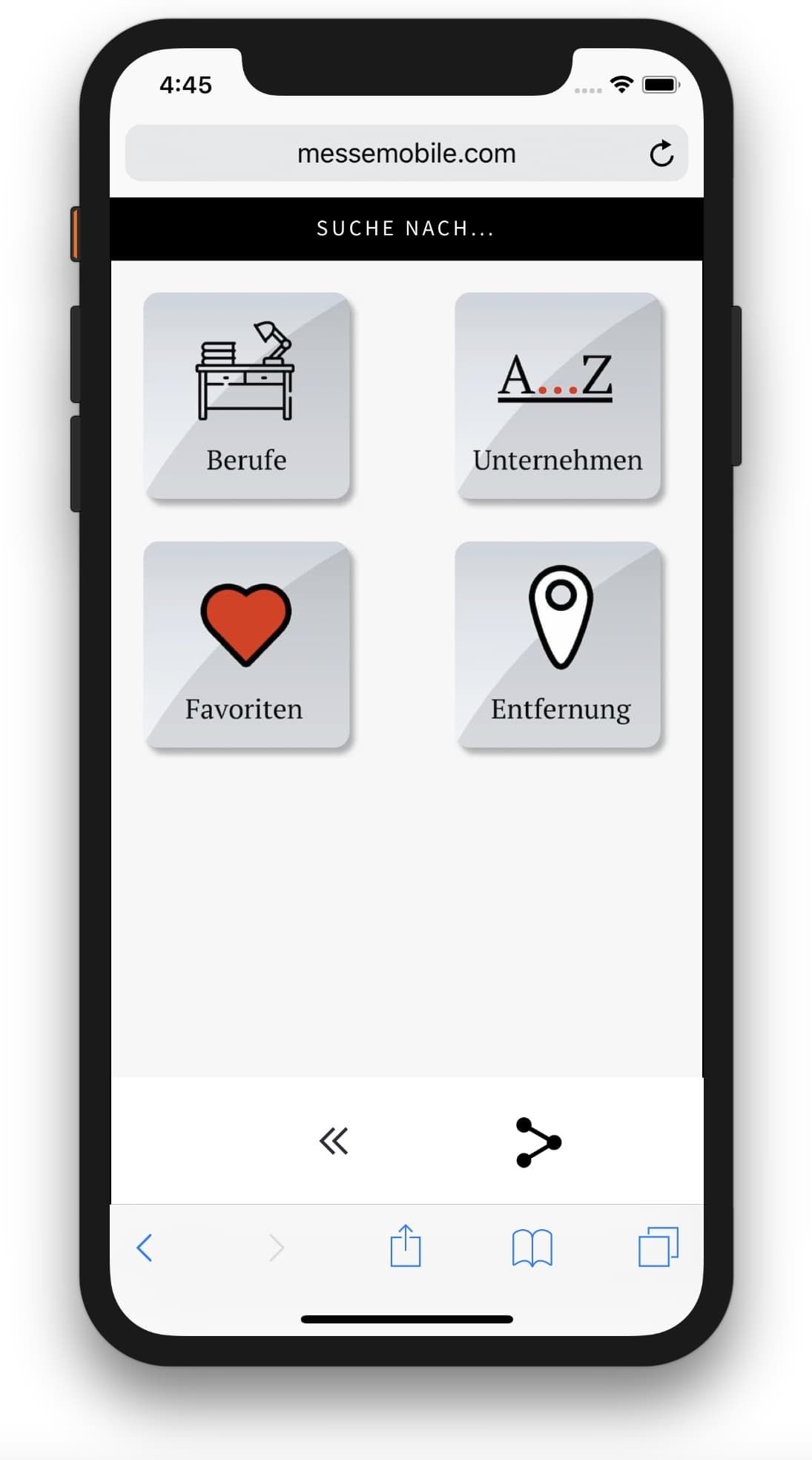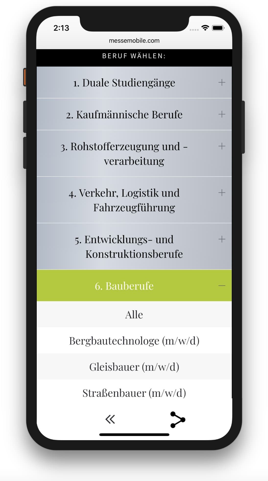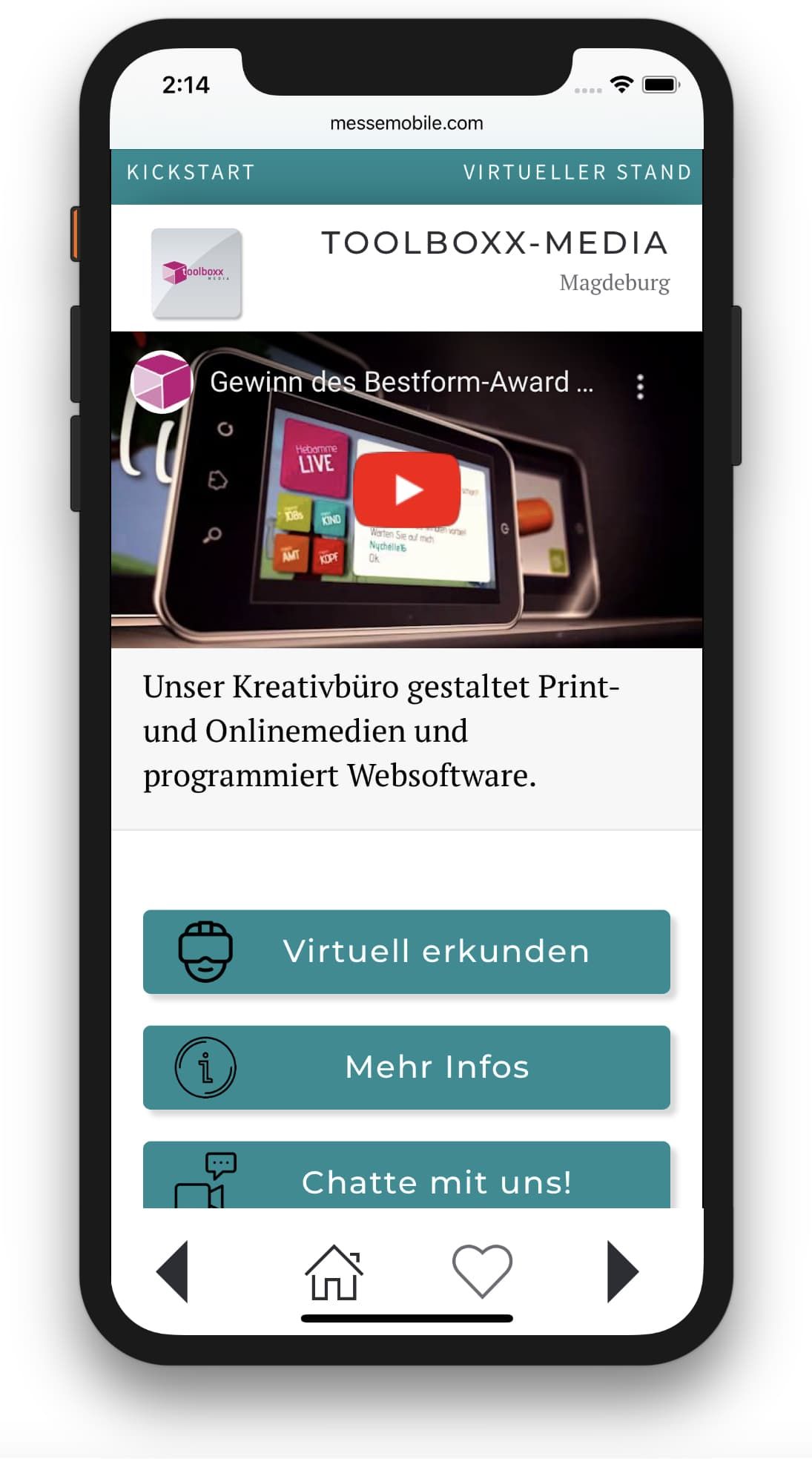Der mobile Smartphone-Messebesucher steht für uns im Mittelpunkt. Daher entfallen bei uns aufwändige 3D-Welten, teure Konferenzsysteme oder zentrale Streamingserver. Wir verknüpfen statt dessen Ihr Unternehmen modular mit bestehenden Anwendungen wie WhatsApp und Youtube zu einem auf das Wesentliche reduzierten Messetool. Sie entscheiden, was Sie benötigen.