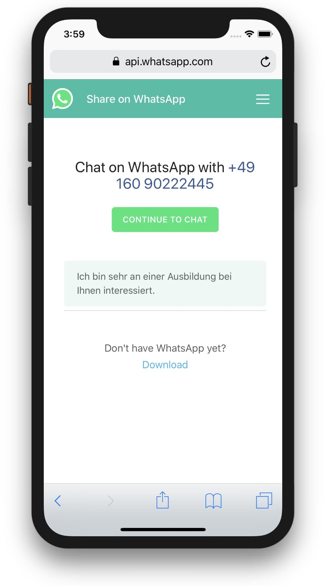 Kommunizieren Sie mit Ihren Besuchern in gewohnten Welten: Chatten Sie live über WhatsApp. Nachrichten gehen direkt auf Ihr WhatsApp-Firmenhandy. Aktivieren Sie bei Bedarf die VideoChat-Funktion in WhatsApp und sehen Sie Ihre Gesprächspartnerin persönlich.