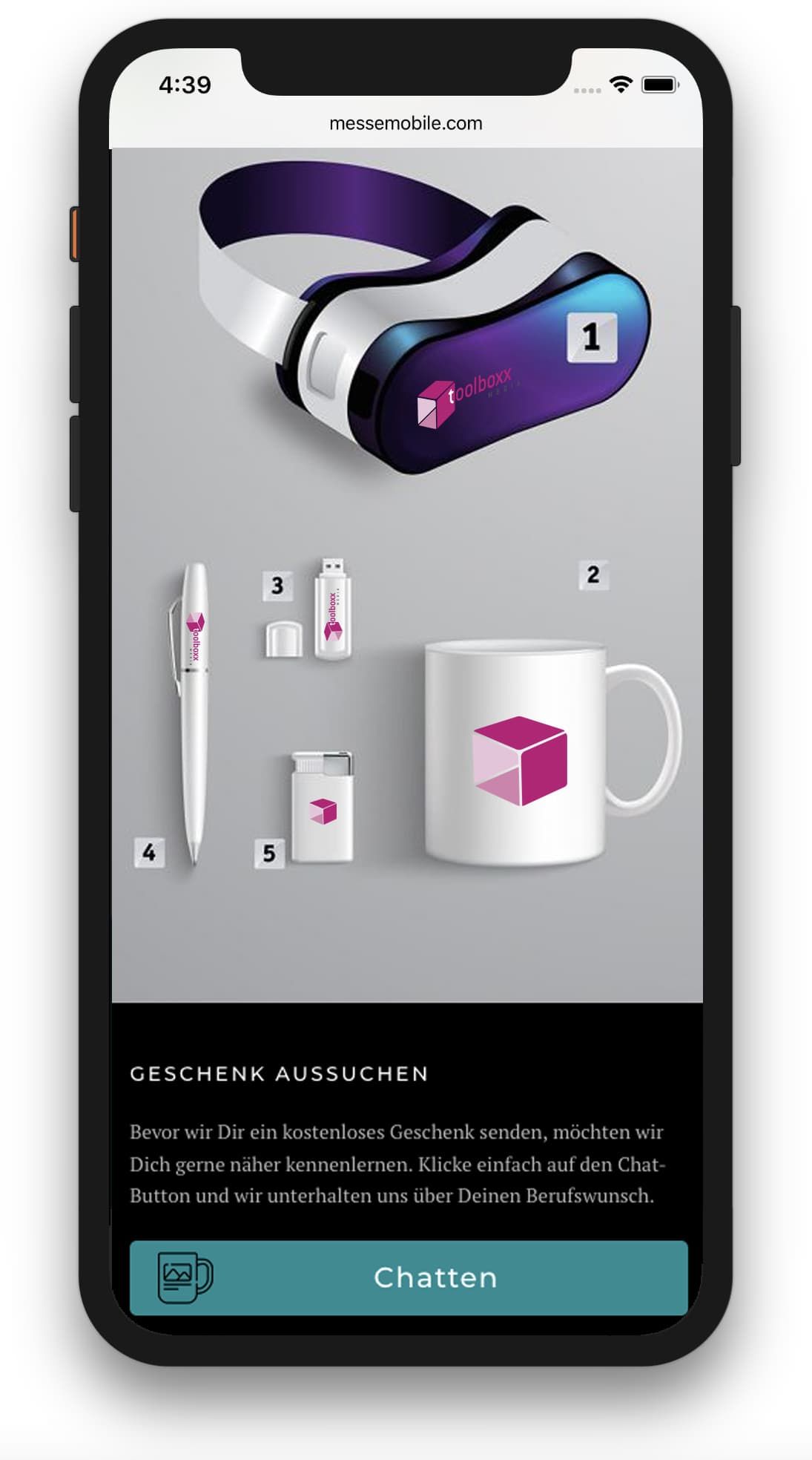 Bleiben Sie im Gedächtnis und geben Sie Ihren Messebesuchern kleine Geschenke mit. Ihre individuellen GiveAways (z.B. Kugelschreiber, USB-Stick, Schlüsselanhänger...) versenden Sie (auf Wunsch auch wir) im Briefumschlag oder Päckchen an Ihre Besucher. Als Highlight empfehlen wir eine gebrandete Smartphone-VR-Brille (bereits ab 14,90 EUR). Damit können Ihre potenziellen Kunden die 360°-Filme Ihres Unternehmens jedderzeit zu Hause betrachten.