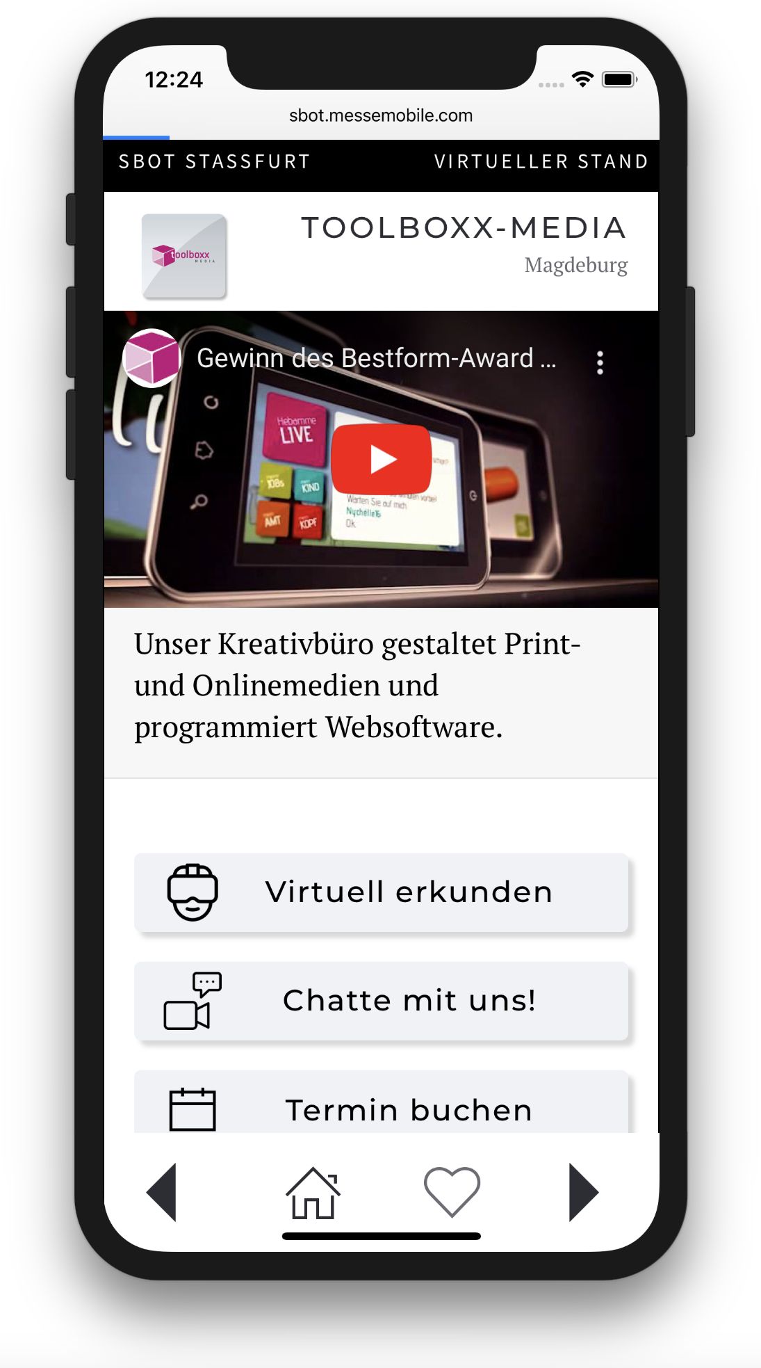 Der mobile Smartphone-Messebesucher steht für uns im Mittelpunkt. Daher entfallen bei uns aufwändige 3D-Welten, teure Konferenzsysteme oder zentrale Streamingserver. Wir verknüpfen statt dessen Ihr Unternehmen modular mit bestehenden Anwendungen wie WhatsApp und Youtube zu einem auf das Wesentliche reduzierten Messetool. Sie entscheiden, was Sie benötigen.